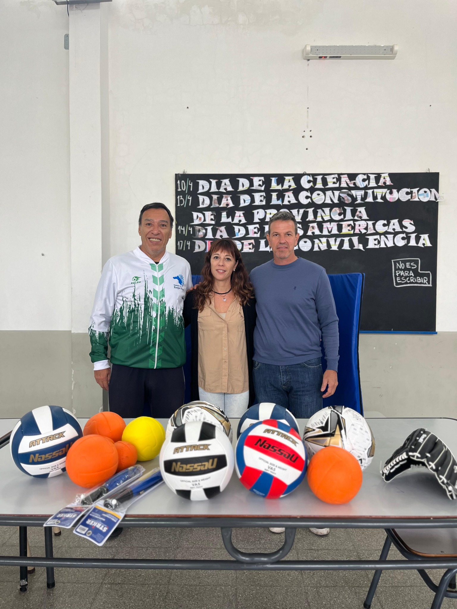 El intendente de Roque Pérez, Maximiliano Sciaini, junto al director de Deportes, Horacio Tossi, realizaron la entrega de materiales deportivos destinados a estudiantes de la Escuela Secundaria Nº 4, ubicada en el Complejo Educativo de la localidad.