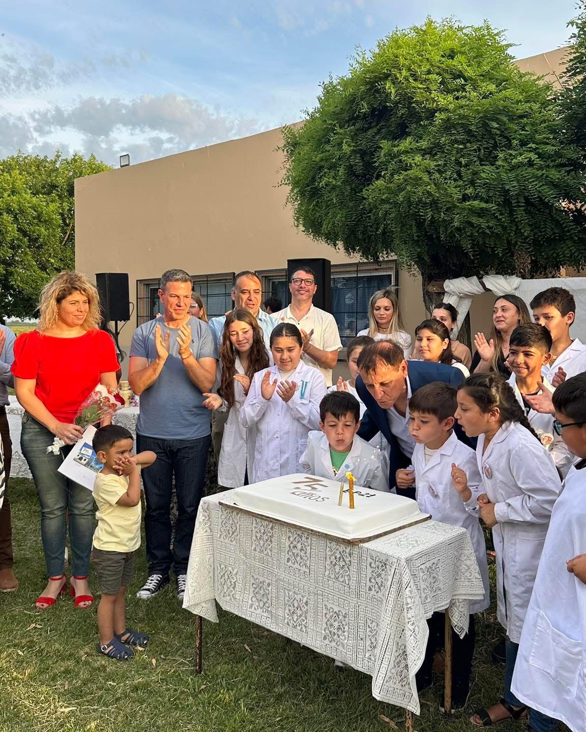 El intendente de Roque Pérez, Maximiliano Sciaini, junto al secretario general Nahuel Tolosa, el presidente del Honorable Concejo Deliberante Gerardo Belardinelli, el director de Asuntos Educativos Jonathan Bustos, el director de la Escuela Primaria Nº 21 Guillermo Buezas, funcionarios, concejales, consejeros escolares, autoridades educativas, vecinas, vecinos, exalumnos y alumnos, exdocentes, participaron de un emotivo acto para conmemorar el 75º aniversario de la institución.