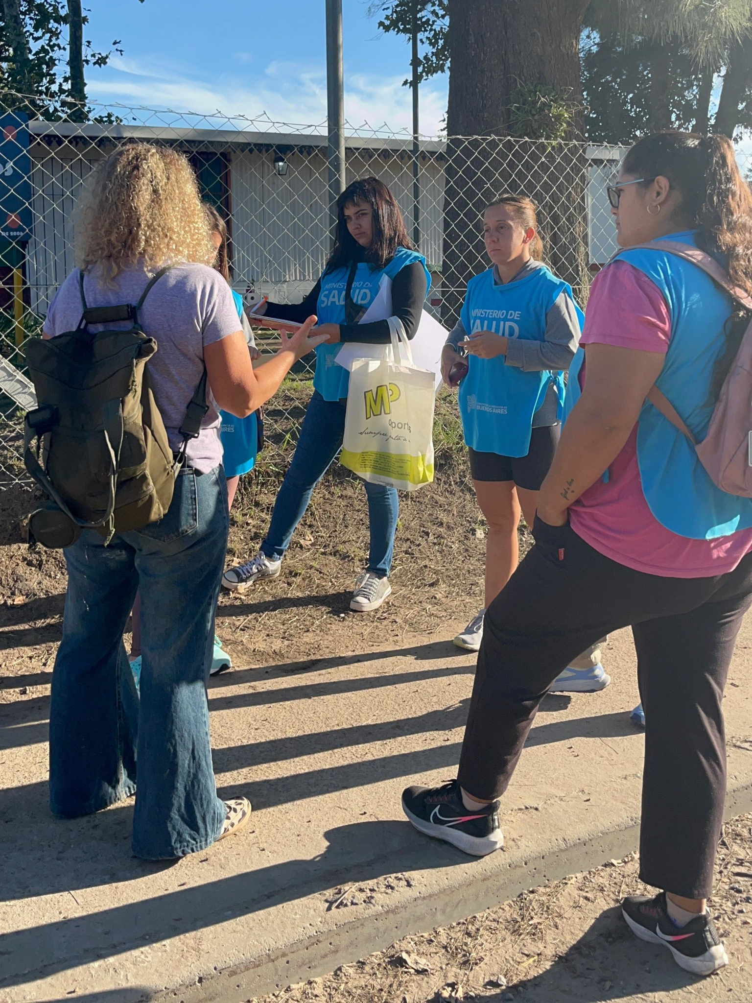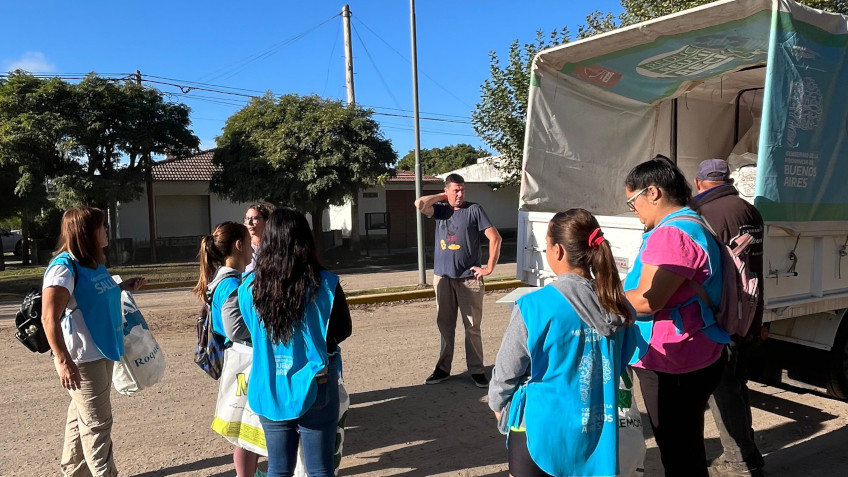 El intendente de Roque Pérez, Maximiliano Sciaini, junto a la directora de Ambiente, Alejandra Sachetti, y las promotoras de Salud, desarrollaron esta mañana una jornada de concientización ambiental en el barrio Federal.